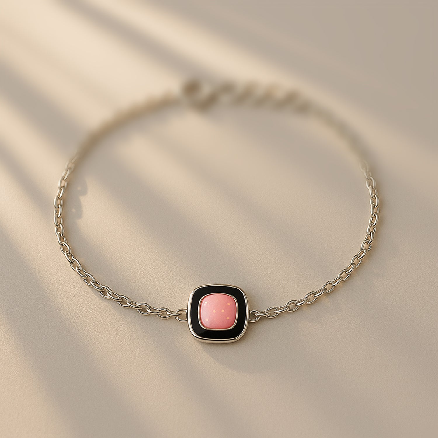 Add a touch of sophistication to your style with this "925" delicate silver chain bracelet, featuring a beautifully crafted centerpiece. The bracelet showcases a square-shaped charm with a soft pink stone, framed in sleek black enamel for a modern contrast. Its adjustable chain and secure clasp ensure a comfortable fit for everyday wear or special occasions. Perfect for gifting or treating yourself, this bracelet pairs effortlessly with both casual and formal outfits.