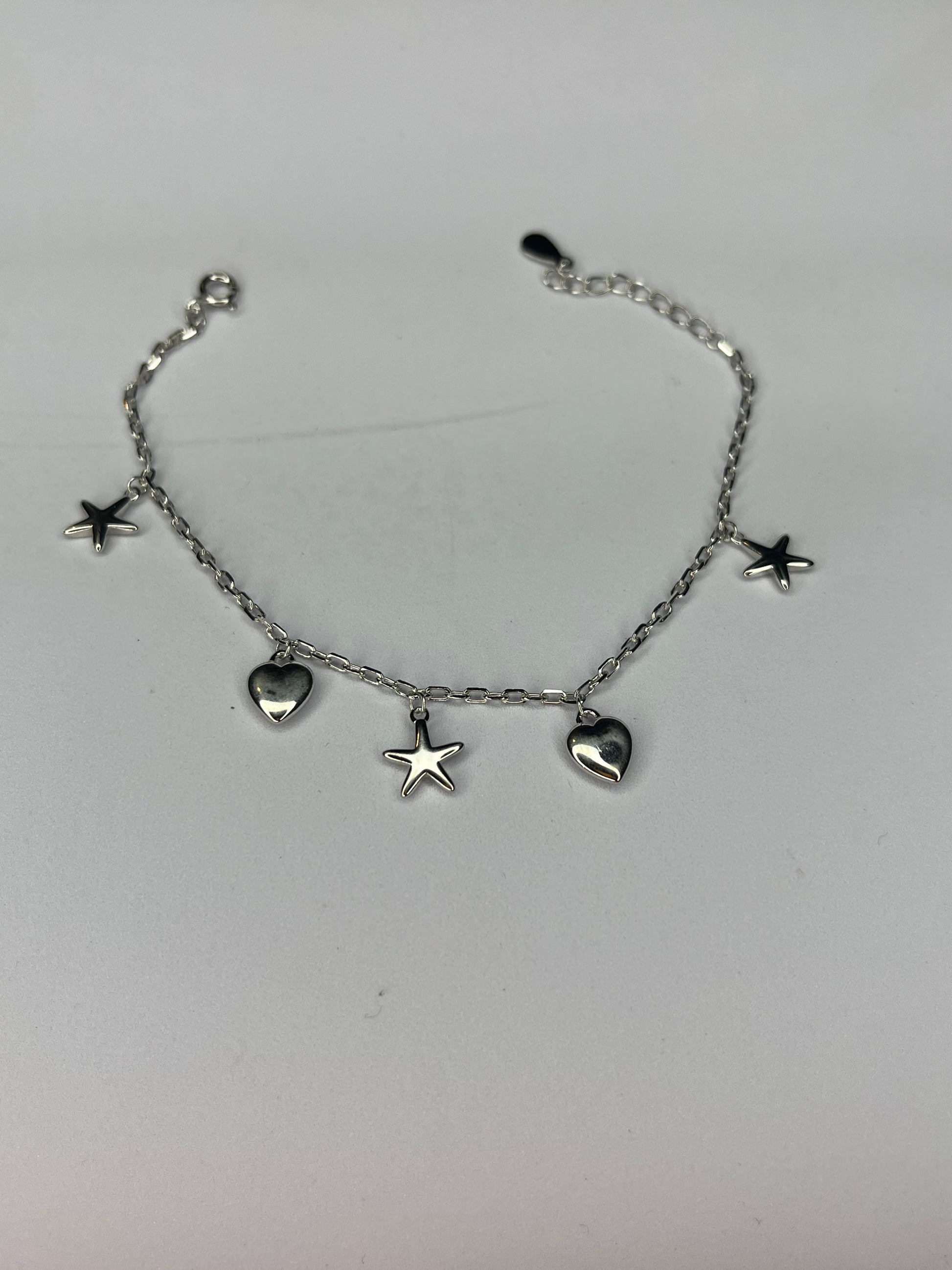 The bracelet features five dangling charms a mix of dainty hearts and twinkling stars – symbolizing love, joy, and positivity. With an adjustable chain and secure clasp, it ensures a perfect fit for everyday comfort.