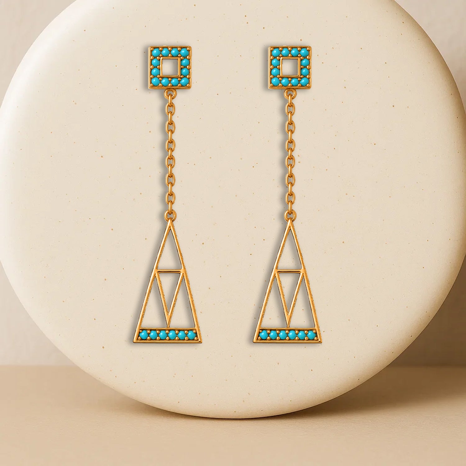 Bold geometry meets boho elegance in the Turquoise GeoDrop Statement Earrings. These captivating earrings feature square and triangle motifs linked with a gold-toned chain, adorned with vibrant turquoise stones that add a fresh pop of color and ethnic charm.